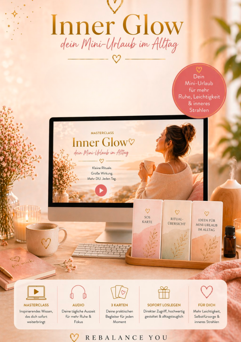 Die MasterClass, die deinem Umfeld nicht verborgen bleiben wird - weil du mit einfachen Mikro-Ritualen lernst, dir trotz vollem Alltag wieder mehr Ruhe, Leichtigkeit und inneres Strahlen zu schenken.